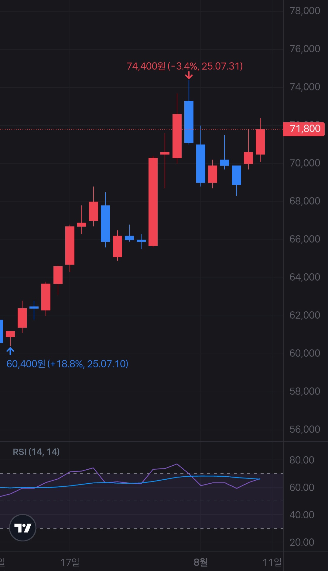 2025년 8월 8일 기준으로 삼성전자 주가 차트를 보면, 이날 종가가 71,800원에 형성되었고 14일 RSI는 약 65 수준이었습니다. RSI 65는 아직 과매수선인 70을 넘진 않았지만, 직전 한두 달 간 주가 상승세가 꽤 강했음을 보여주는 수치입니다.
